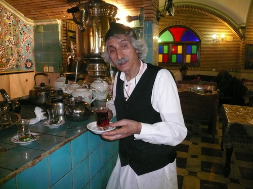 Wir kriegen Tee, Gebäck, 3 Kaffees und bezahlen nur unsere 2 bestellten Käfelis. Der Besitzer quetscht uns aus, was wir den vom Iran denken und von den Leuten, erzählt uns von Amerika und und und. Der eine Kellner, ein altes Manndli, kommt zu jedem Tisch mit "Esfan" (oder so irgendwie). Ein Topf mit Kohle in der Hand, nimmt er den Russ, verteilt ihn kreisförmig und murmelnd über den Köpfen und klopft einem am Schluss auf den Rücken. Das bringe Glück, gute Gesundheit und Geld.