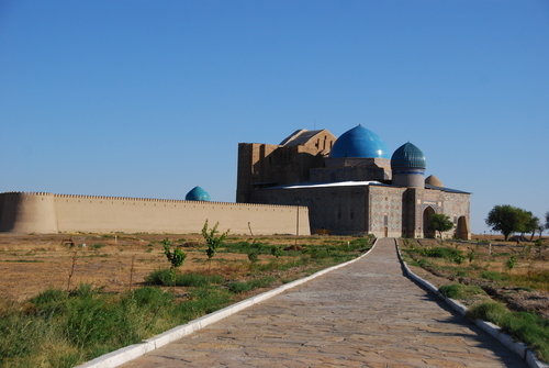 Es ist heiss und wir warten mit der Besichtigung des Yasaui Mausoleum bis die Sonne etwas tiefer steht. Gute Ausrede zum Faulenzen. Erst als sich die Sonne in der blauen Kuppel schön spiegelt, machen wir uns auf den Weg. Am Eingang liegt ein Haufen Kopftücher. Auch ich binde mir eines um, um meine Locken zu verdecken. Die Halle ist eindrücklich. Extrem hoch und alles weiss gestrichen. Die Stimmung ist gedämpft, man wagt sich gar nicht laut zu sprechen. Ich stelle mir vor, wie wohl ein Lied auf meiner Flöte hallen würde.