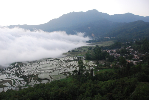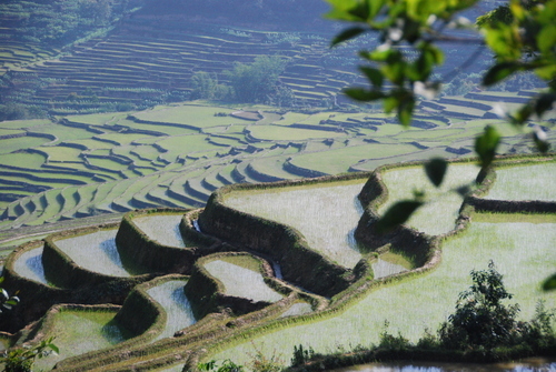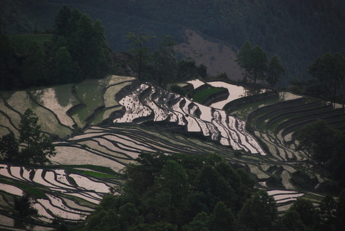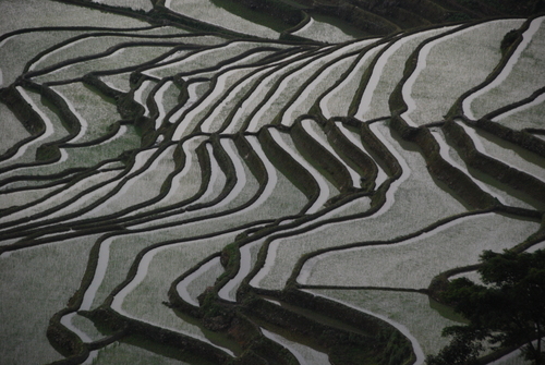 Heute stehen wir schon vor Sonnenaufgang über den Reisterrassen von Yuanyang. Der Himmel ist blau, über die Reisfelder zieht ein dichtes Nebelmeer, dass sich langsam auflöst, das Wasser der Felder spiegelt sich in der Sonne - einfach wunderschön. Danach besuchen wir noch diverse Reisterrassen und sind von jeder wieder von