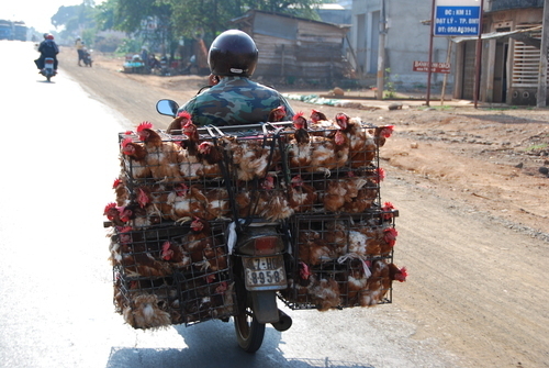 Da wir nur in 5 statt 6 Tagen nach Hoi An fahren, ist heute ein langer Tag mit vielen Kilometern. Da stärken wir uns doch erst einmal mit einer Nudelsuppe. Ohne Dolmetscher kriegen wir immer Nudelsuppe. Heute essen wir halt Nudeln (ohne Suppe) mit Huhn zum Frühstück. Was für eine Tagesgrundlage... Das Ganze kostet 24'000 Dong. Wir geben 25'000 und warten auf unser Rückgeld. Da sie gerade keine 1'000 Dong zur Hand hat, erhalten wir 2 Wrigley's Kaugummis. Wir verkaufen sie an unsere Fahrer weiter und ich hoffe, dass Su einen davon abkriegt. Er liebt rohen Knoblauch und ich verstinke fast hinter ihm auf dem Töff.